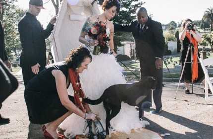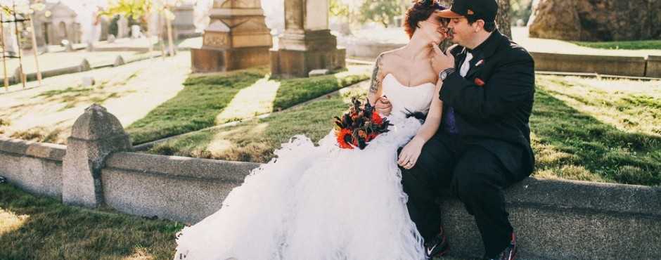 The bride arrived in a coffin. Instead of the bridesmaids, four pallbearers wheeled her coffin to the altar. The guests stood next to graves. No, that’s not a funeral. That’s how Kristen & Joe married at Mountain View Cemetery Oakland, CA. The idea was to not see death as something scary, and to begin the marriage from the place where it would eventually end.