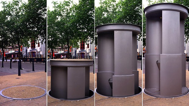 You are walking on a London street at night. You are pretty sloshed. You need to pee. You spot a cylindrical public loo that looks like a time machine. You unburden yourself and head home. The very next morning you happen to pass by the same street. It’s the same place, the same pastry shop on the roadside, the same signboard on the crossing. But somehow you can’t spot the giant time-machine loo. No, you weren’t that drunk that you imagined the whole thing and peed on the pavement. It’s the loo that has vanished. This is the UriLift Public pop-up Toilet you’d find in London. These disappearing urinals are the perfect examples of utilization of space. They stand solid every night for the benefit of night-owls with a tad too many gallons of beer into their systems. Come morning and they do a Cinderalla act. Yes, they are sucked into the ground. Not a trace of the structure. Maybe that is also how houses disappear in horror stories.